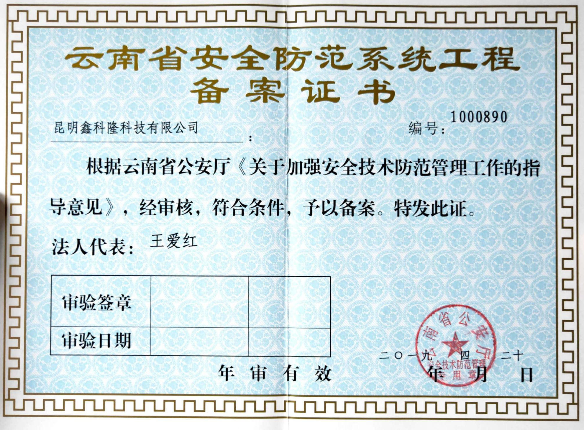 云南安全防范系统工程备案证书